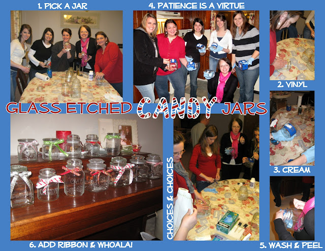 Candy Jar Craft:What Ornament Exchange would be complete without a Craft? Sticking to our Candyland theme and thanks to KBro & her new addiction to YHL, we decided to etch glass candy jars. Magically, I found [at the Thrift store] 12 glass jars that would work perfectly. I LOVE a good deal! They were so cute in my head and I have to say they turned out just as cute in person. So fun! A bit crazy to try a brand new craft for the first time with 12 ladies at a Partay but what better people to experiment with? Hurray for etching glass! We are like experts now! We got BIG plans for the future. Watch out world- etched glass casserole dishes with our names on them are coming next!